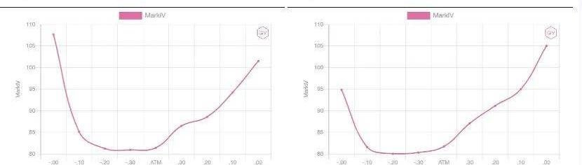 观测以太坊的隐含波动率曲面,中短期的隐含波动率曲面延续了上周的右偏形态。