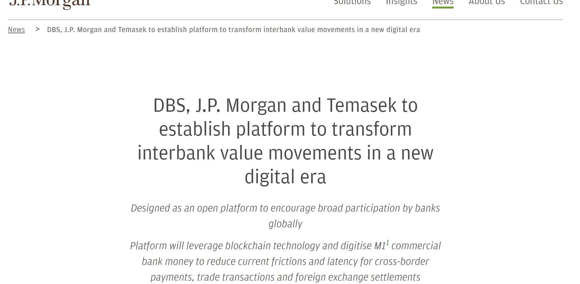 4月28日,摩根大通、星展银行和淡马锡发布公告称将组建科技公司Partior,并设立开放区块链平台促进支付业务的数字化转型。