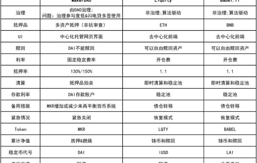 下表展示了Maker与Liquity及Babel.fi机制对比