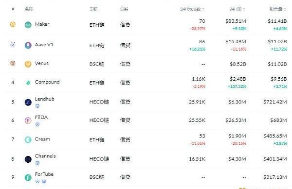锁仓量排名前十的借贷平台排名来源:DeFibox