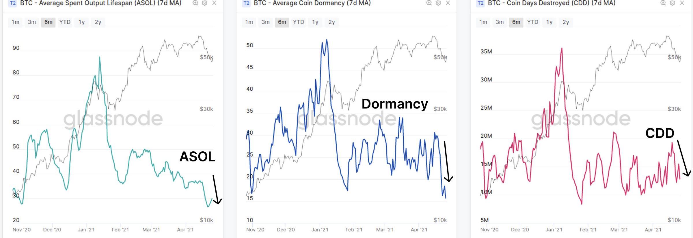 事实上,如果我们分析一些币龄指标,我们可以看到一贯的趋势,即旧币保持大量休眠状态,从而导致所有指标的下降趋势。下面的图表显示了三个不同的寿命指标,说明了这个有凝聚力的故事: