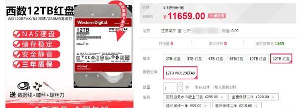 西部数据红盘12TB目前在京东上价格为3499元,但是无货。而在淘宝上,现货价格已经涨至11659元。