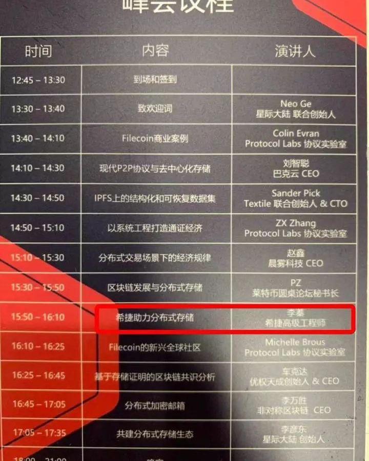 就在律动BlockBeats搜索资料时,发现了一张区块链峰会议程图,图片里面,希捷高级工程师赫然在列。