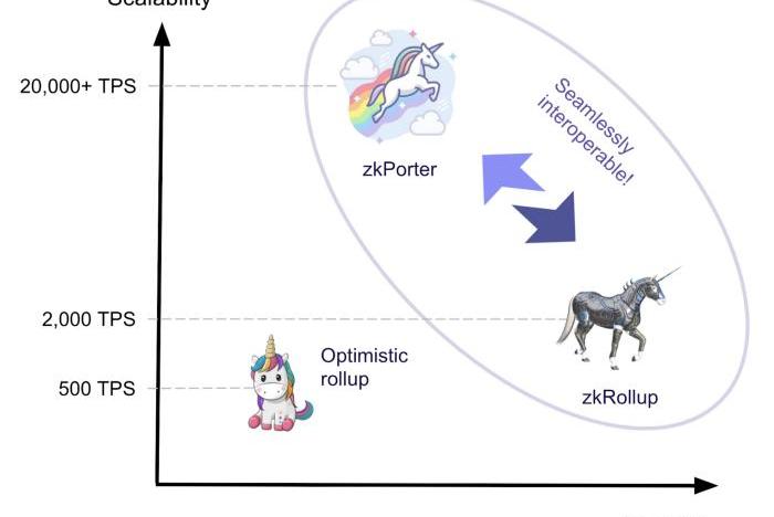 二者具备可组合性和互操作性:zkRollup上的合约和账户可以与zkPorter上的账户无缝交互,反之亦然。从用户的角度来说,唯一能察觉到的区别是zkPorter账户将交易费减少了100倍。