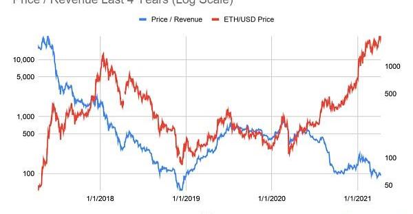 该比率是一个回溯性的衡量标准。以下是ETH从2020年4月到现在的价格/收入统计数据: