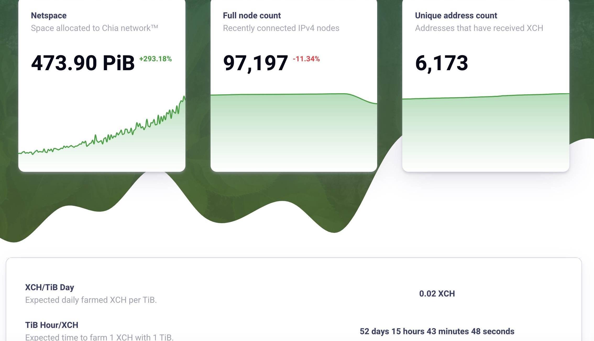 根据chiaexplorer提供的数据显示,当前Chia网络的挖矿存储空间为473.90PiB,每TiB每天可挖到的XCH数量为0.02。