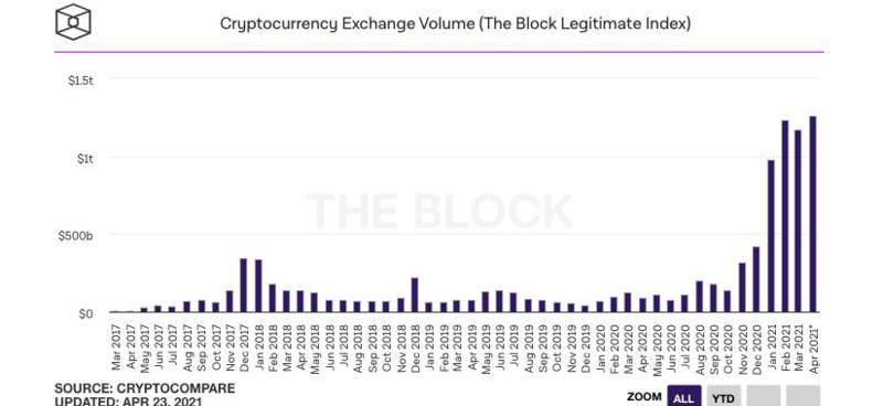 TheBlock?追踪的合法交易场所的交易量本月达到了有史以来的最高水平。到今年?4?月为止,加密货币交易所的交易额超过了?1.26?万亿美元,略高于上月的?1.17?万亿美元。