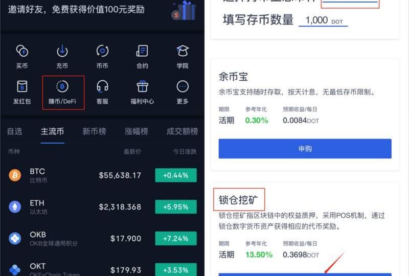 可以自己下载波卡钱包参与,这里有一份欧易OKEx情报局之前出的钱包质押教程:《奶爸级教程:Polkadot/Kusama挖矿与投票,从此代币不再缩水》。当然,也可以通过交易所的通道一键参与,这里以欧易OKEx为例,在APP首页点击“赚币/DeFi”,选择币种“DOT”,有余币宝、锁仓挖矿、定期生息几大产品,可以根据需要自行选择赚取收益。