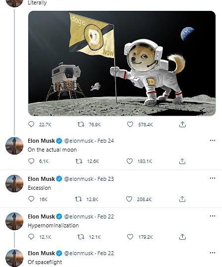 2月24日,马斯克又连发5条与狗狗币有关的推文,暗示将把狗狗币放到月球上。