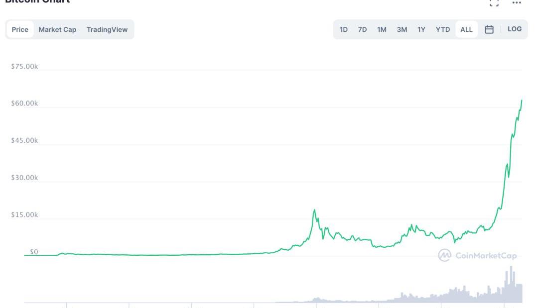 今年3月13日,比特币价格创下61795.8美元/枚的历史新高,币圈鼓胀出一种戏剧又滑稽的复仇气息——一年前,也是3月13日,从超过7900美元起,币价在24小时内跌掉一半,到了3869.5美元的历史低点——铆住3月13日,历史翻转了180度。整整一年,比特币价值暴涨近16倍。