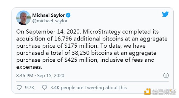 MicroStrategy是引爆这一趋势的著名公司,这是一家在纳斯达克上市的商业情报公司。该公司在8月至9月间购买了价值约4.25亿美元的比特币,成为世界上第一批公开持有比特币的上市公司之一。目前MicroStrategy声称拥有38250枚BTC,约占比特币总量的0.182%。
