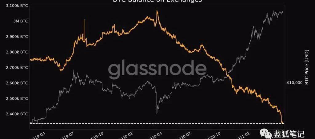 BTC价格上涨但交易所中的余额在下降