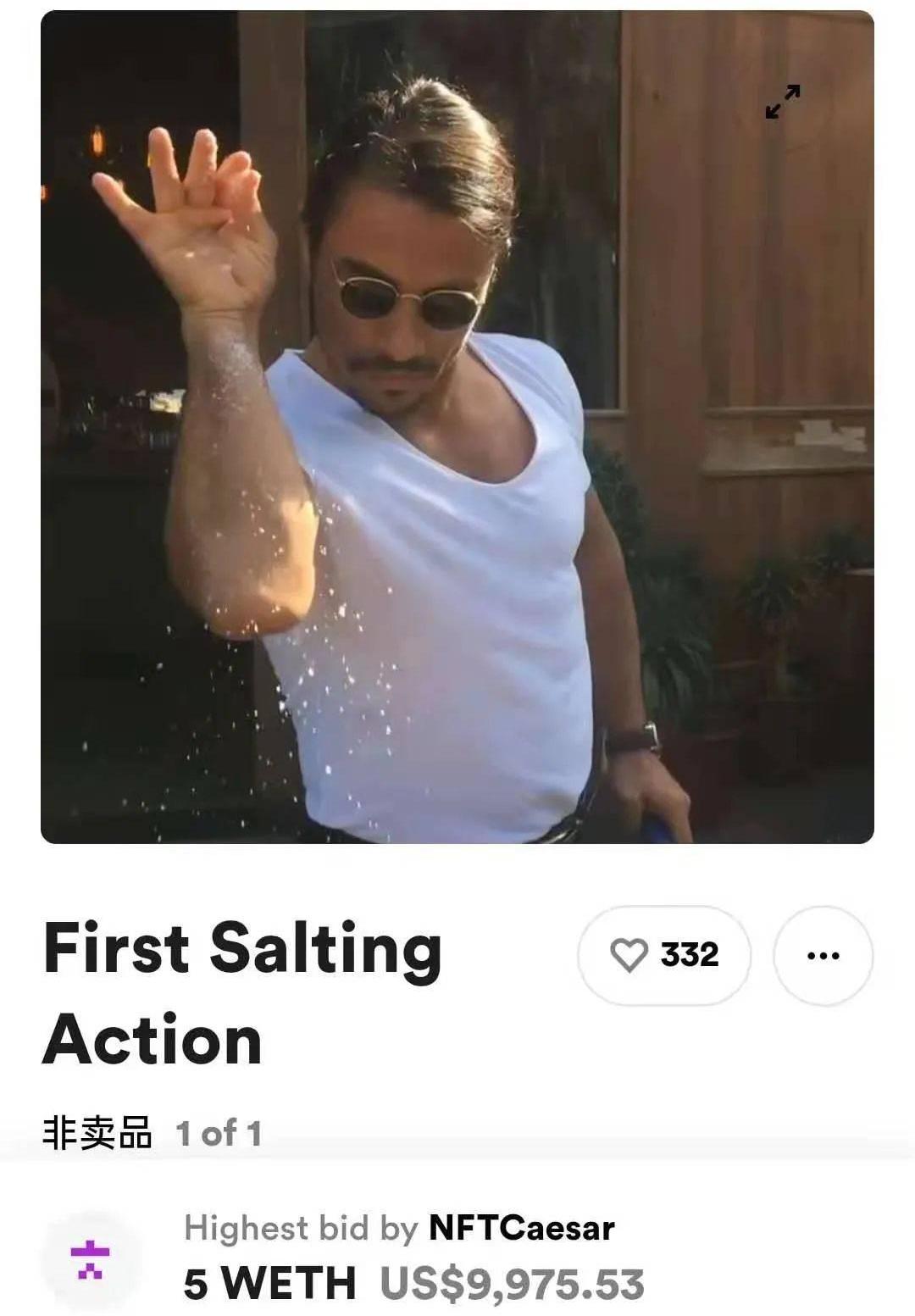撒盐哥在2017年因其将撒盐的动作做出高级感而火遍网络,被网友戏称为拥有“世界上最咸肘子”的男人。3月30日他在Rarible将他爆火的那条视频铸造成NFT,在描述中他写道:“2017年1月7日,我因为在视频中撒盐而出名。”最终该NFT以5ETH的价格成交。除了著名的撒盐视频NFT,撒盐哥还制作了刀和人偶的NFT。