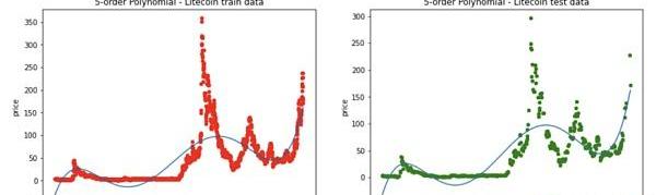 我对Litecoin的历史价格进行了简单的多项式回归,使用5、25和80的阶数。在每种情况下,R2值将提供一些关于模型在测试数据集上的拟合度好坏的信息。