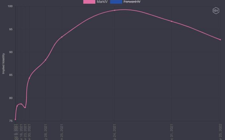 以太坊期权隐含波动率期限结构,截至4月5日18:00,数据来源:gvol.io