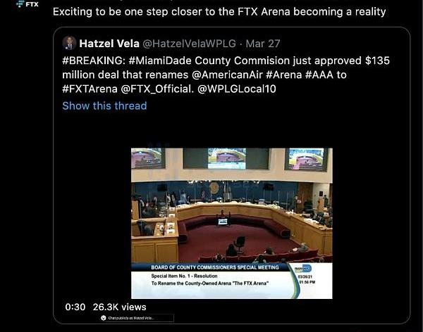 ?3月27日,迈阿密戴德县官方投票结束,以10-1的票数,1.35亿美金的金额,通过了加密货币交易平台FTX将冠名迈阿密热火队主场球馆的投票.?