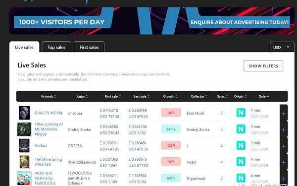 不管是niftygateway还是opensea上每天的交易量都是巨大且杂乱的,所以对NFT选手们就需要一个类似于defi中的defipulse这样的第三方数据网站,cryptoartpulse会把这些平台上实时的交易作品和价格数据显示出来,并且还很贴心的展示了该笔交易的涨跌幅,炒画嘛,大兄弟们,哈哈。