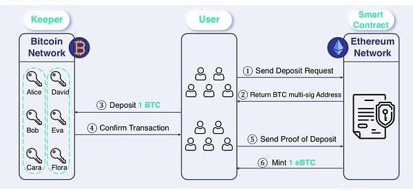 部署在以太坊上的智能合约负责铸造eBTC。用户可以通过简单且安全的方式实现原生比特币资产的代币化。下面这张图以简化的方式展示了eBTC的铸造过程: