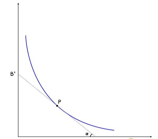 斜率的现实意义是,它反应着在P点时,B减少的数量与A增加的数量比例,或者B增加与A减少的数量的比例,也就是A和B两种币的兑换比例,也就是A和B的汇率、即价格。