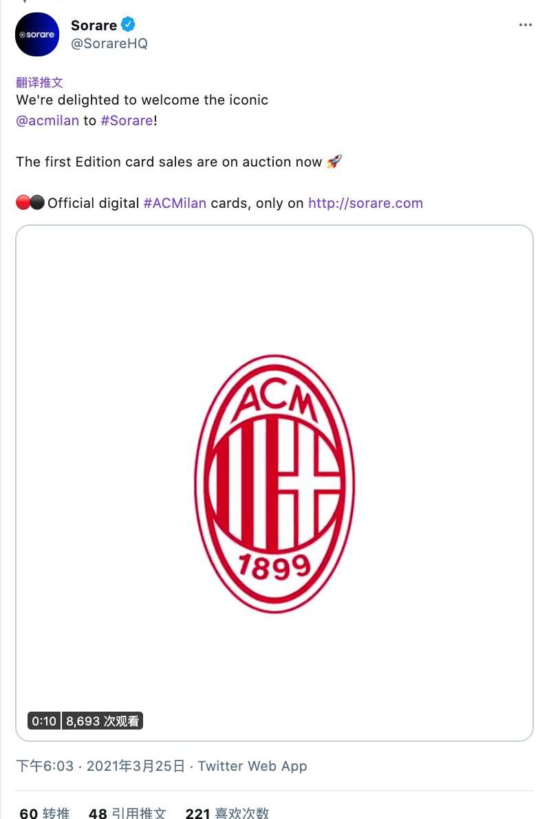 AC米兰足球俱乐部与Sorare达成合作,将发售球星卡NFT