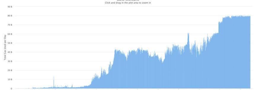 好吧…我们知道,Visa正在把经济活动放在以太坊区块链上,而更重要的是,我们已经看到以太坊的增长,但问题是:以太坊上的经济活动依然受桎梏束缚。下图展示了以太坊区块链上日均gas费用消耗情况,基本上可以说明以太坊区块链上经济活动状况。