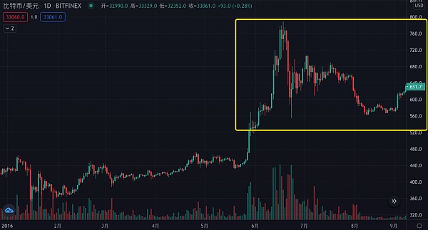 随着后续利差开始回升,比特币的避险属性会更着重显现。目前,比特币牛市先于黄金牛市,比特币的避险属性来自于外汇挤兑,黄金的避险属性来自于信用对冲。短期来看需要注意技术性回调,下图是 2015--2016 年比特币的走势,需注意拥挤交易后的多头平仓带来的大幅回调。