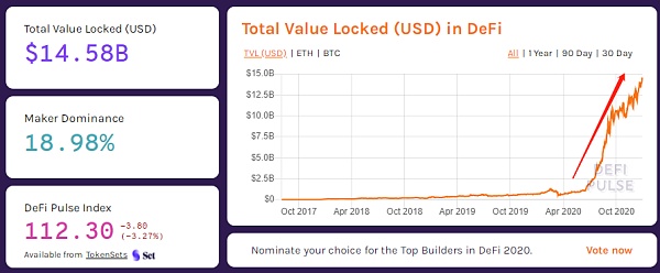 TVL(total value locked)锁仓价值是衡量DeFi发展的重要指标,现在已经140多亿美金锁仓,今年3月份这个数字才不到10亿美金。发展速度可以从图片中昂扬向上的红色箭头看出来。
