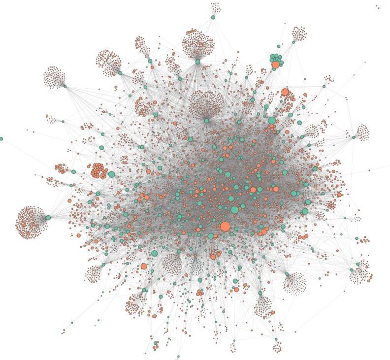 下面可以看到GitcoinGrant合作子图的可视化。解读图时,捐赠者用蓝色节点表示,贡献者用橙色节点表示。所有捐赠者的总贡献决定了捐赠节点的大小,而贡献者节点的大小则由他们对所有捐赠者的贡献量决定。节点之间的网络连接表示从捐款人流向赠款人的捐款。