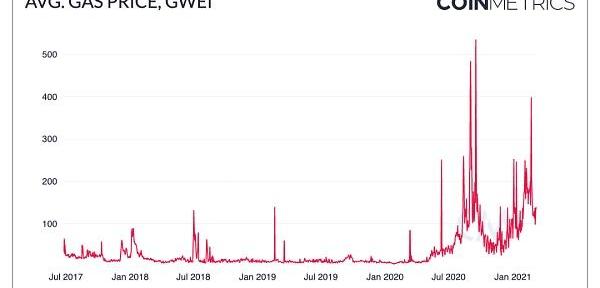 2020年9月17日,在Uniswap进行UNI空投后,gas平均费用高达500GWEI。2021年,随着DeFi继续升温,gas平均费用再次飙升,而ETH价格急剧上涨也吸引了新一批的交易者和投机者入场。