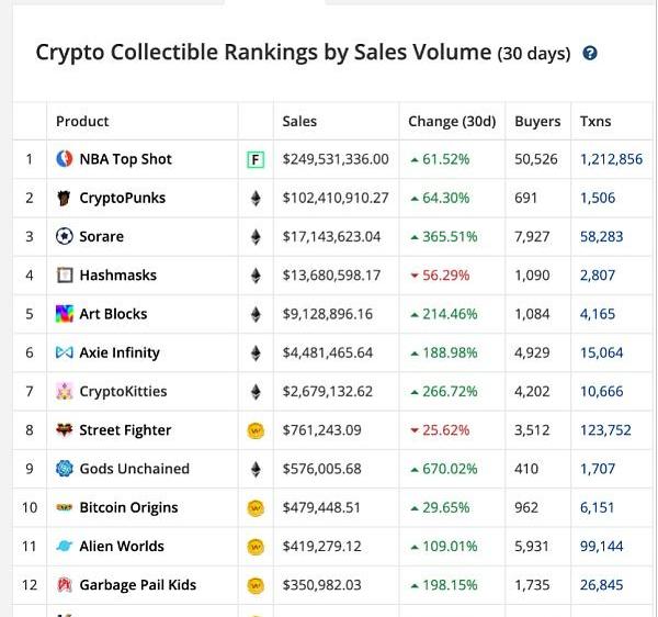 据CryptoSlam平台的销量得知,在过去30天里,在五个最受欢迎的NFT项目分别是NBATopShot、CryptoPunks、Sorare、Hashmasks、ArtBlocks,其中销量最高的NBATopShot的交易量达到了2.4953亿美元,比上个月增长了61.52%。造成NFT的交易量暴涨的原因可以粗略归结为如下几点: