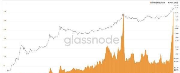 另外,从比特币的地址分布也可以明显看出来,拥有少量BTC的地址逐渐增加,这几乎是散户进场的佐证,近段时间的新增用户数已经超过了2017年的顶峰。