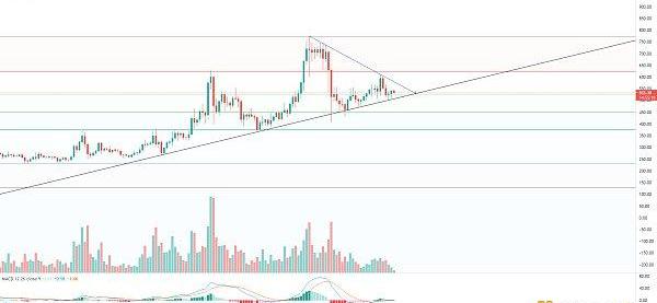 指标线持平粘合,成交量萎缩,酝酿变盘的迹象,走势图也是三角末端整理,短期支撑510美金,趋势支撑450美金,大方向维持震荡向上。