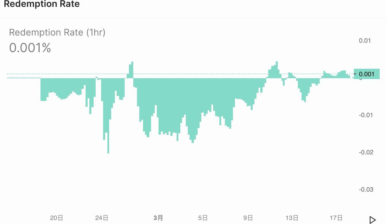 RAI不锚定任何货币,最初的赎回价从圆周率3.14开始,通过一系列参数降低波动率。从官网可以看到,RAI的赎回率基本一直维持在0附近,这是RAI赎回价与市场价之间的差值,所以近期RAI的价格并没有大幅偏离系统中的赎回价。