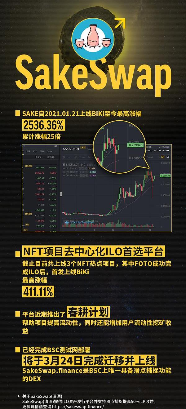 而在这些利好功能的推动下,SakeSwap的治理代币SAKE总市值超过了3000万美金,自2021年1月上线BiKi后累计涨幅最高达到2536.4%。SAKE可以让流动性提供者和交易者继续从协议开发中获益,这意味着早期采用者将成为SakeSwap的重要利益相关者。