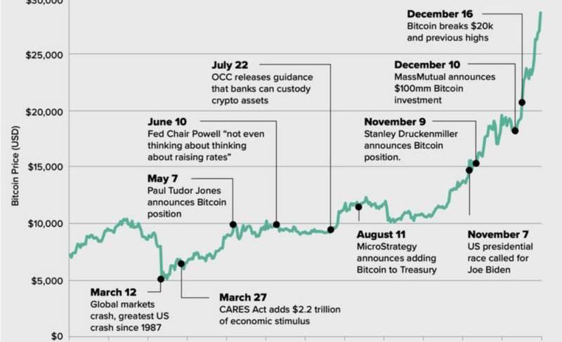 而比特币在此期间更是上演反转。比特币先是经历“312暴跌”,价格在两日内腰斩。3月23日,美联储在早前7000亿美元购债计划基础之上,再度推出一项范围广泛的无限制量化宽松举措。随后,比特币以及全球资产开始逐步企稳回升,甚至接连创出新高。下图展示了比特币在2020年价格上涨的走势以及与之相关的大事件。读者们可以在图中清晰看到比特币价格和“消息面”之间的关系。