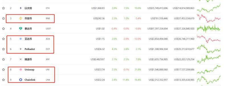 上图为目前加密市场排名前十的币种。在排名前十币种中,UNI、LINK属于DeFi龙头;ADA和波卡则属于高性能扩容以及跨链龙头;BSC等平台公链则可以归为以太坊侧链,其主要得益于承接以太坊溢出价值。这从侧面也展现出本轮牛市的重要特点:DeFi的金融创新和扩容等技术创新无疑是资金的主要关注对象以及认可的发展方向。