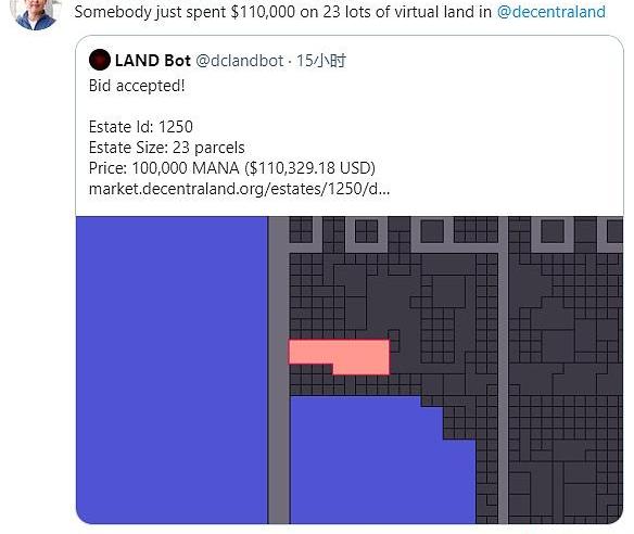 3月14日,灰度创始人BarrySilbert转发了一条推文,并评论表示“有人刚在Decentraland上花了11万美元购买墨西哥的虚拟土地”。该推现已得到了380+的点赞,并有多个大佬热评!