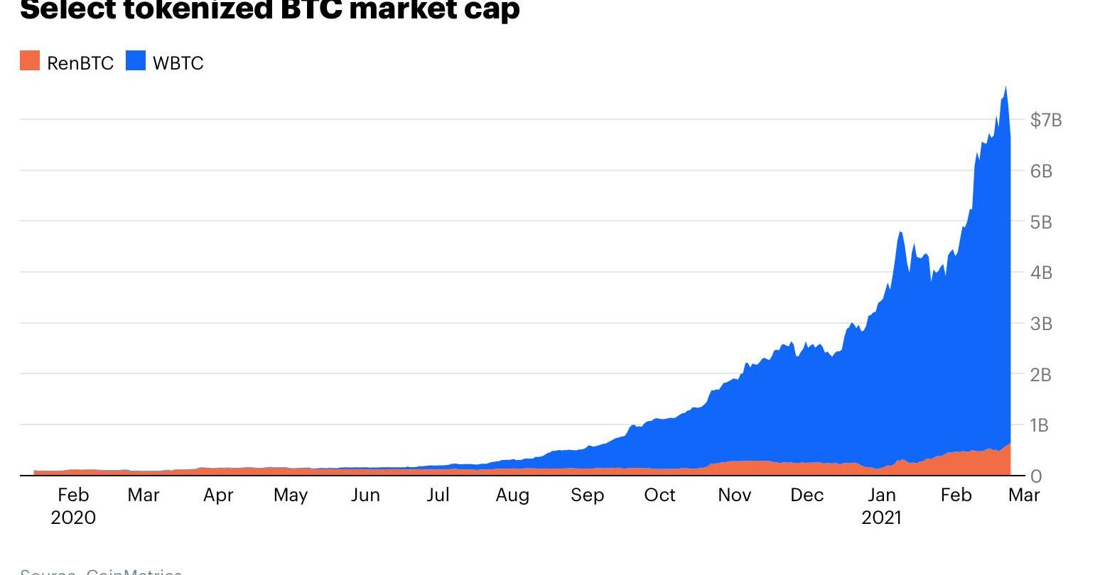 以太坊经济中一个规模较小但增长迅速的组成部分是“wrappedtoken”,它允许那些非以太坊原生加密货币在以太坊区块链上使用,并容易与DeFi应用程序交互。因此,代币化比特币的价值大幅上升。