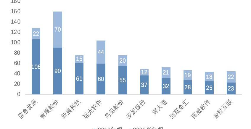 由上图可以看到,10家上市企业2019年财报中提及“区块链”次数均在20次以上,有5家企业提及次数超过50次。而2020年半年报中“区块链”出现次数也均在10次以上。从财报信息来看,10家上市企业主要通过自主研发的方式开展区块链业务,涉及业务领域包括金融、供应链、食品安全、医疗、能源、数字政务、数字传媒等,具体的业务场景或产品/服务包括供应链金融、供应链管理、药品溯源、区块链电子发票、版权可信存证等。