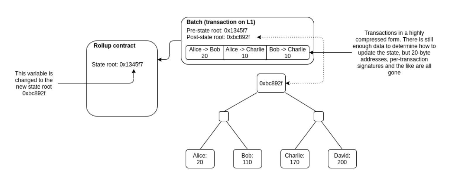 任何人都可以发布批次(batch),这是一种以高度压缩形式的交易集合,包含了先前的状态根和新的状态根(处理交易后的Merkle根)。合约检查批处理中的先前状态根是否与其当前状态根相匹配;如果是这样,它将状态根切换到新的状态根。