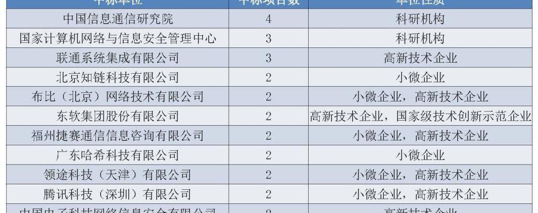 从具体单位来看,包括中央网络安全和信息化委员会办公室、自然资源部信息中心、全国海关信息中心在内的各级信息化部门是重要的招标主体,共发布了22个招标项目,占到了全部项目的19.5%,国家税务总局深圳市税务局、福州市大数据发展管理委员会、广州开发区经济和信息化局等17个单位都发布了不止一个招标项目;中国信息通信研究院等11家单位都获得了不止一个项目的中标,其中9家都是企业,6家为小微企业。