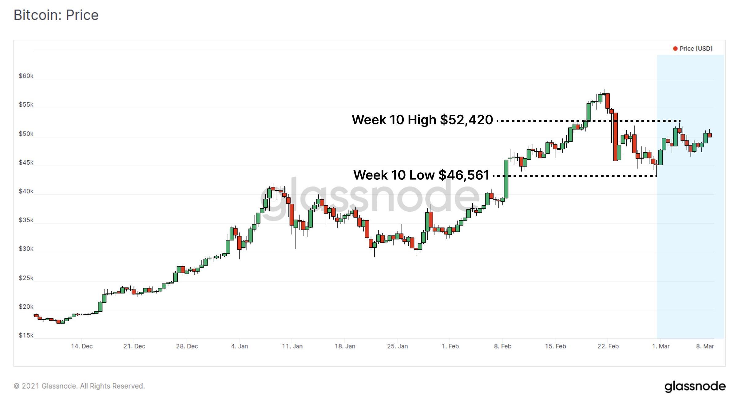 本周,比特币市场的波动性有所下降,令人印象深刻的是,尽管股市与贵金属市场的表现都非常疲弱,但BTC依旧维持在WillyWoo于上周提出的4.5万美元链上支撑位上方。