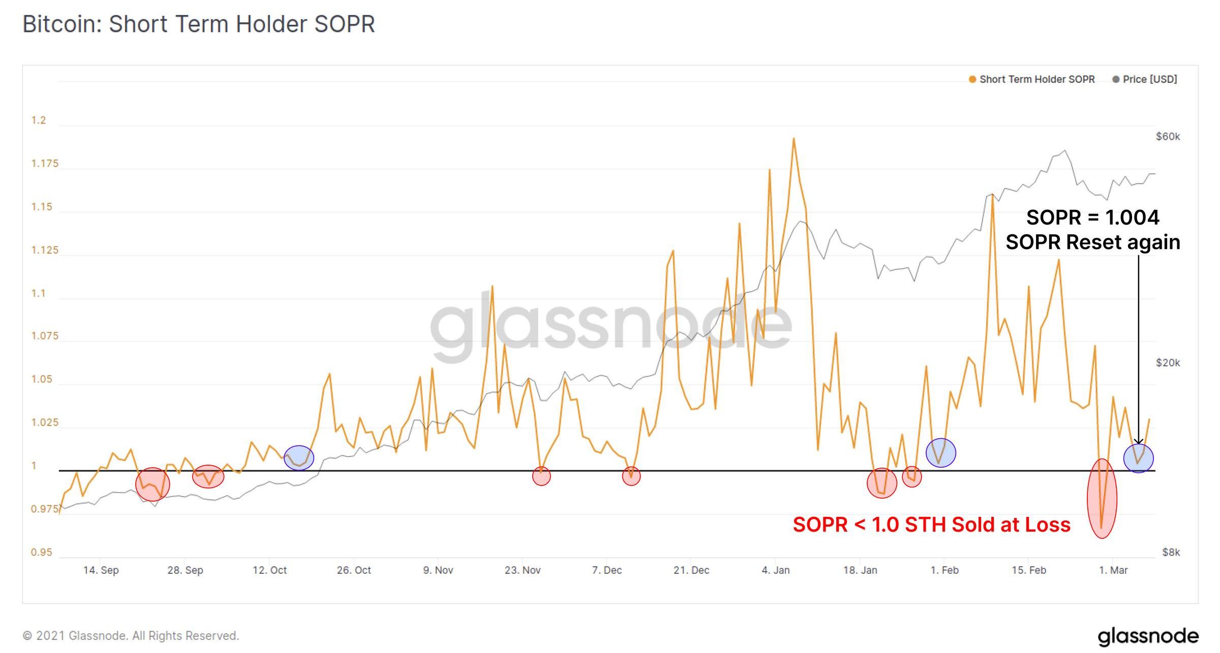 上周,我们看到了SOPR指标跌到了1.0以下,我们认为这是新的散户投资者遭受损失的第一个指标。本周我们看到SOPR-STH回调至略高于1.0的水平,尽管价格走势在横向巩固。