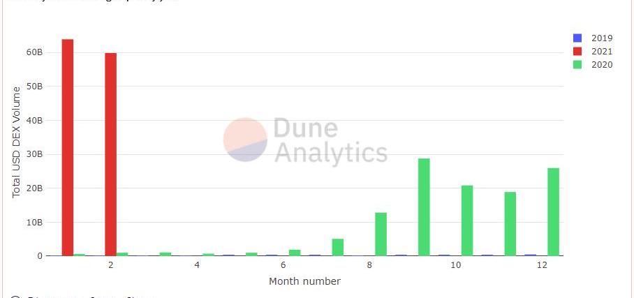 在2021年的前两个月中,DEX的交易量已超过前几年的总和。