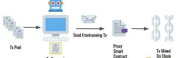套利机器人通常会在一些交易池中查找特定类型的交易,并尝试根据预定算法提前进行交易。广义来看,front-running的操作者可以通过复制交易,并且用自己的地址替换相应地址的方式在找到的任何复合条件的交易里赚钱。甚至可以执行交易,然后通过复制其执行生成的有利可图的内部交易。