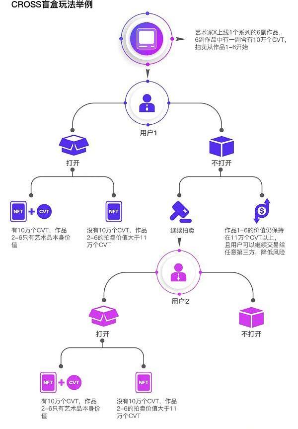 第一期2月26日上线的盲盒游戏,会在当日10:00正式发起竞拍时间为4小时的4副NFT作品拍卖。获拍者可以在1小时内选择二次转拍或是打开NFT盲盒——如果选择二次转拍,卖家可以自定转拍金额和转拍时间;如果选择打开盲盒,若中奖这游戏结束,若没有中奖,则另外三幅作品的中奖概率增加,同时3副NFT作品的价值也会越来越高。如果NFT盲盒都没有被打开,CROSS官方会在2月27日的10:00系统自动打开盲盒,公布最终获得0.5个BTC等值CVT的地址。