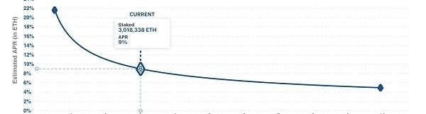 目前,ETH2的收益约为APY的9%,当存入1000万ETH时,收益率将下降至4.9%。