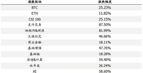 从细分板块来看,支付交易、物联网&溯源、文娱社交、基础增强、存储&计算、纯币类、AI表现均优于ChainextCSI100平均水平,为87.50%、81.99%、46.66%、47.76%、59.40%、26.24%、58.6%;商业金融、基础链表现逊于ChainextCSI100平均水平,为18.11%、18.28%。