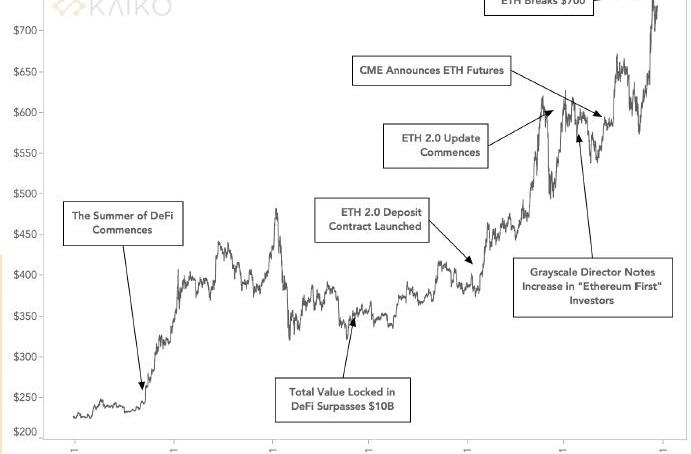 比特币并不是2020年唯一成功的数字资产。以太坊在推出ETH2.0之后,迎来了新的发展势头,这同样也是有史以来最大规模的网络升级。本月,芝加哥商品交易所宣布将上市ETH期货,而Grayscale表示,ETH的机构投资者也将越来越多。在比特币牛市的尾声中,ETH终于突破了700美元高点,但ETH交易价格仍比其历史最高价低近800美元。