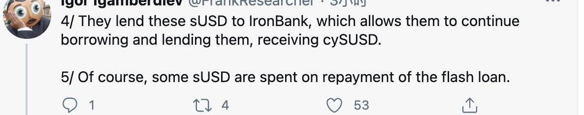 2.他们通过两次交易来完成此操作,每次借出资金并还给IronBank,同时接收cySUSD。